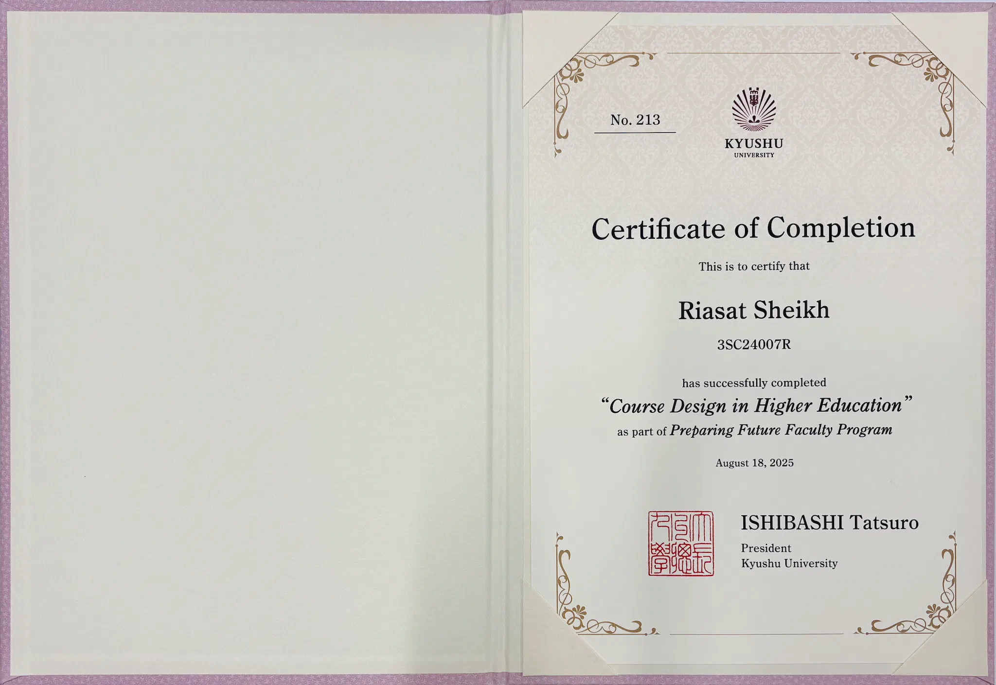 I completed the Preparing Future Faculty Program at Kyushu University and received certification in Course Design in Higher Education (CDHE).